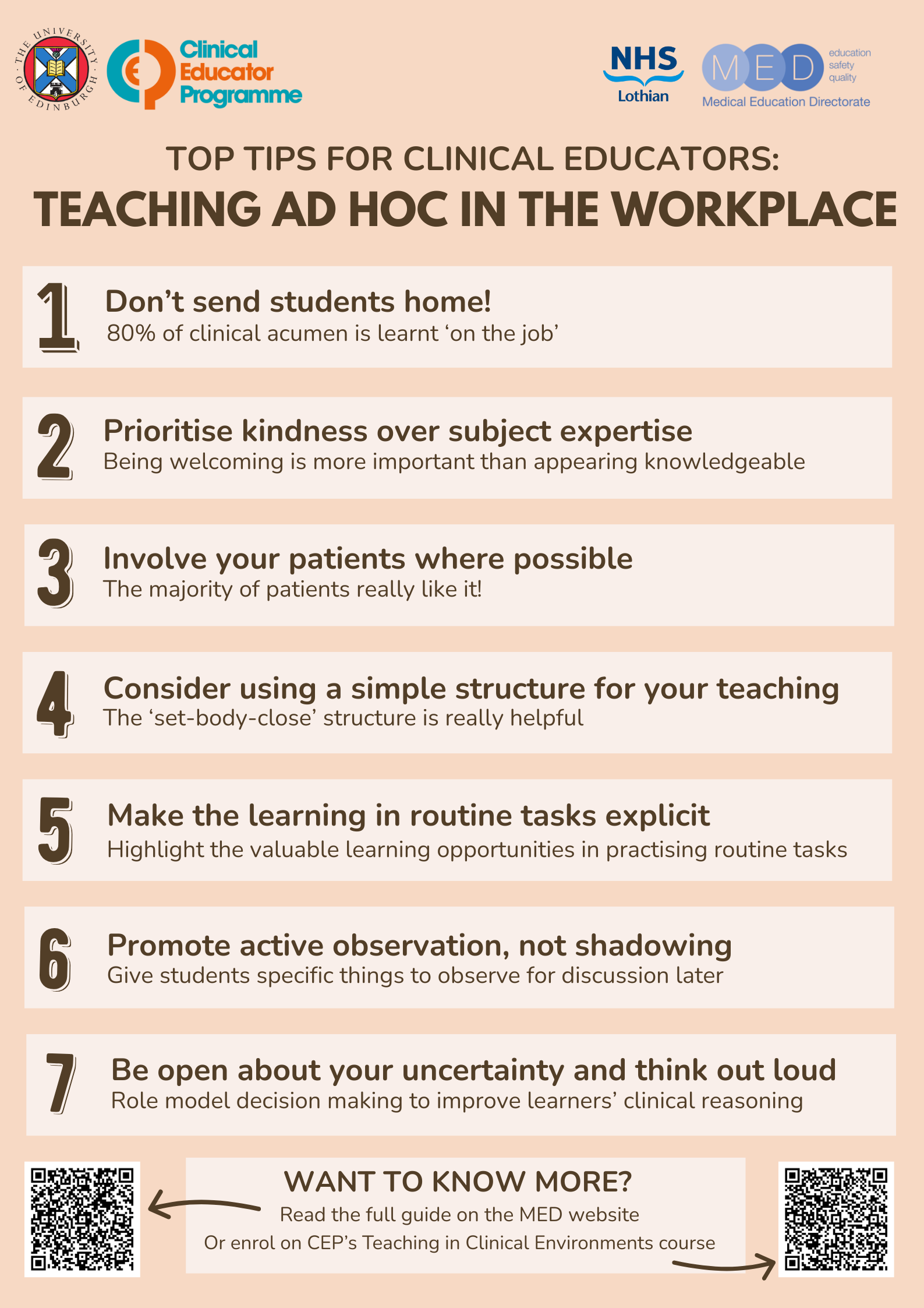 This guide is for you if you want to know how to teach students who arrive at your workplace when you have had no time to plan teaching. ‘Workplace’ is defined broadly; out-patient clinic, hospital ward, surgical theatre, biomedical lab, home visit, etc.